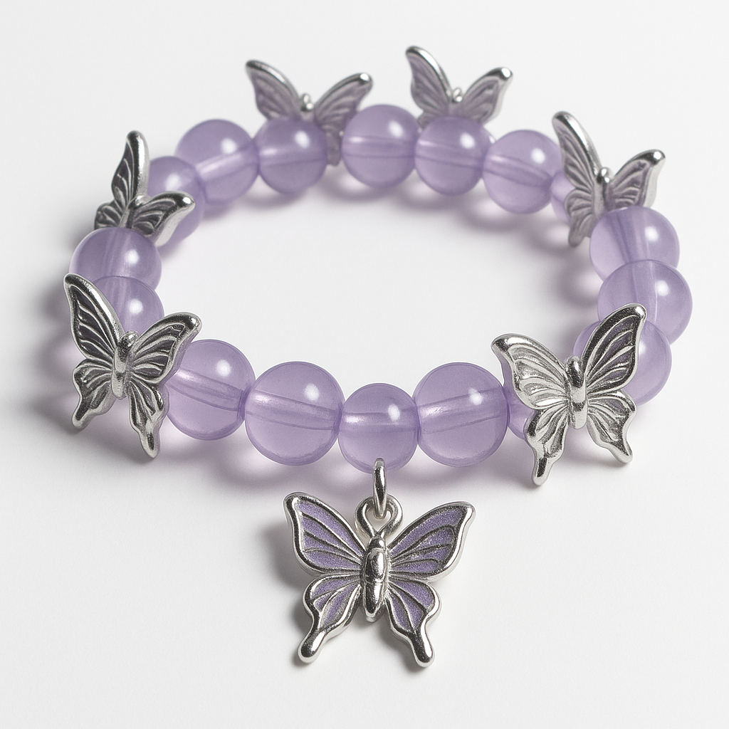 Amethyst Flight Butterfly Bracelet – Lavender Glass Beads with Silver Charms