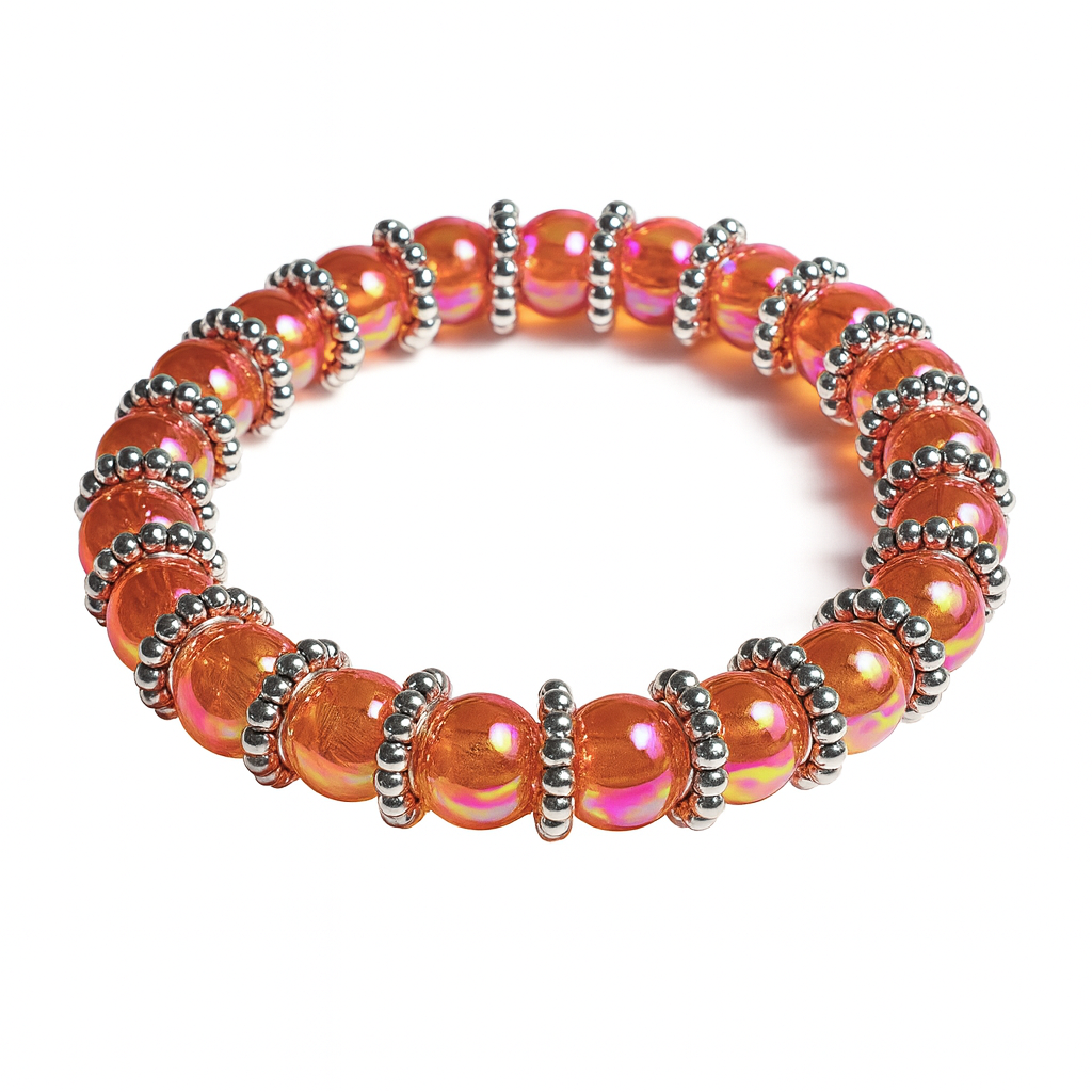Amber Glow Bracelet – Iridescent Orange Beads with Silver Accents