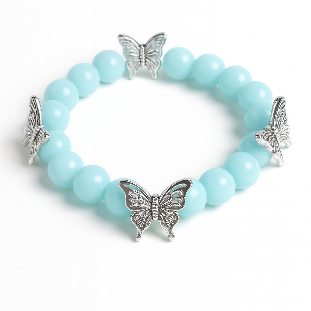 Aqua Butterfly Charm Bracelet – Sky Blue Beads with Silver Butterflies