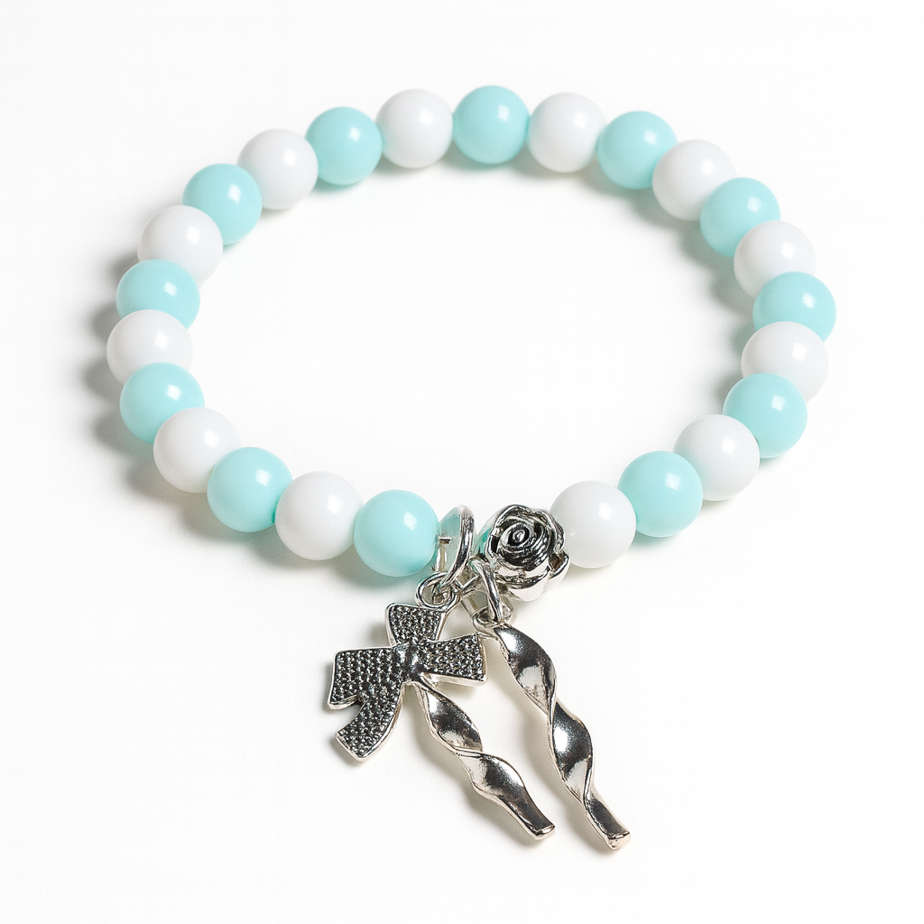 Aqua Charm Bracelet – White & Turquoise Beads with Silver Bow and Rose Charms