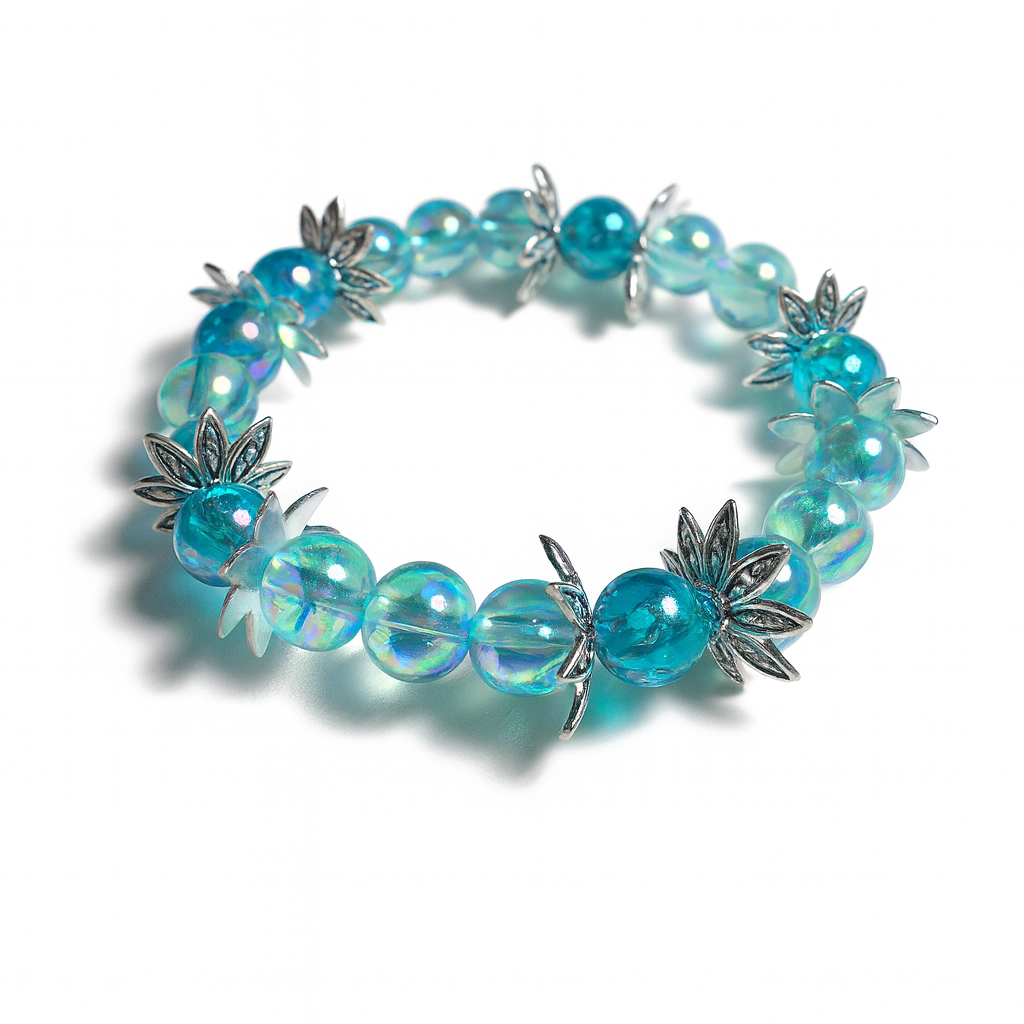 Ocean Bloom Bracelet – Aqua Iridescent Beads with Silver Lotus Accents