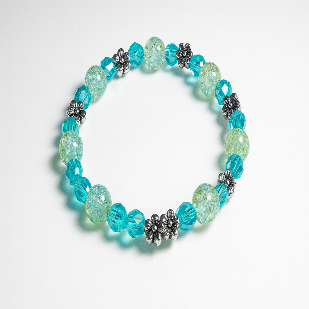 Ocean Bloom Bracelet – Aqua & Green Cracked Beads with Silver Floral Accents