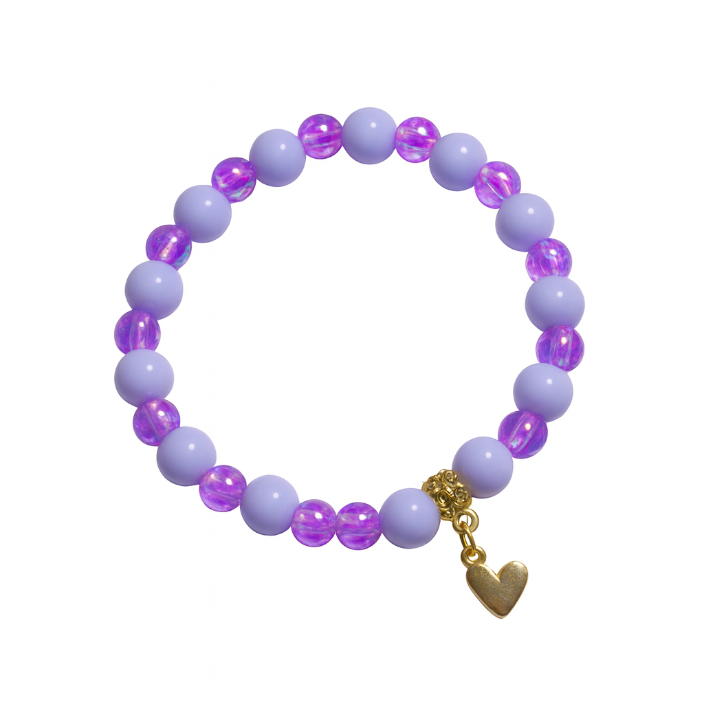 Violet Heart Charm Bracelet – Lavender & Iridescent Beads with Gold Accent